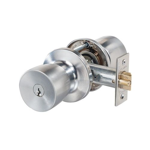 Outside opened by knob when unlocked. Key locks or unlocks exterior knob but does not retract bolt
